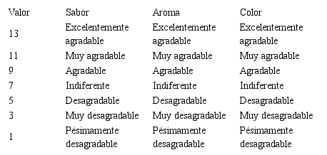 La evaluación organoléptica de los tratamientos en estudio se realizó con un panel de degustadores semi-entrenados compuesto de 20 panelistas. Los panelistas juzgaron el “nivel de agrado” para los atributos sabor, aroma y color, mediante el uso de la escala hedónica 1 a 13 puntos (Hernández, 2005; Ramírez-Navas, 2012).