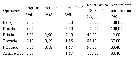 En la tabla 4 se muestra el resultado de la producción de pasta de coco, mediante balance de materia, para observar el rendimiento de cada una de las etapas de producción.
