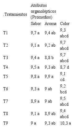 El análisis realizado respecto a la clasificación de los tratamientos de acuerdo con los atributos organolépticos sabor, aroma y color del licor de coco, se muestran en la tabla 6.