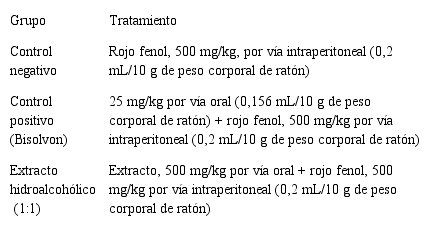 La evaluación preliminar de la actividad mucolítica del extracto hidroalcohólico (1:1) se realizó en el Bioterio clase II, siguiendo el modelo de rojo fenol en secreciones de ratón (Engler y Szelenyi, 1984) [13]. Se pesaron 100 mg del extracto seco y se disolvieron en 5 mL de una mezcla conformada por agua:etanol:tween 80 (90:5:5). Se emplearon 15 ratones entre machos y hembras, reproducidos en el Bioterio de la Unidad Académica de Ciencias Químicas y de la Salud, con un peso entre 31 g y 52 g. Los animales se mantuvieron en condiciones ambientales, de limpieza y alimentación propias para la especie. El acceso al agua y a la comida fue ad libitum. La muestra fue administrada por vía oral utilizando una cánula intragástrica. Se confeccionaron tres grupos los cuales fueron dispuestos en cajas independientes, con un total de cinco animales por cada grupo, debidamente identificados. La distribución de los animales en los grupos se realizó de manera que en cada grupo existieran diferentes pesos y sexos.
