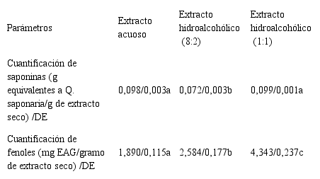 La cuantificación de saponinas y fenoles totales realizadas a los extractos se presenta en la tabla 3. Se puede apreciar que la mayor concentración de saponinas se obtuvo en los extractos acuoso e hidroalcohólico (1:1). El análisis de varianza demostró que esas concentraciones no fueron estadísticamente diferentes (P>0,05), sin embargo, el contenido de saponinas obtenido fue estadísticamente diferente (P<0,05) con respecto al extracto 8:2.