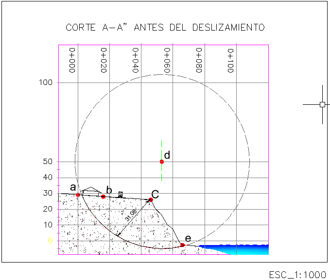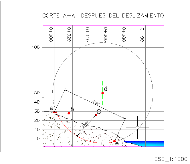 Con los parámetros mecánicos obtenidos en los ensayos, se modeló con GeosLope el deslizamiento en el Barrio 2 de febrero ubicado en la Parroquia Anconcito (Figura 9), donde se obtuvo el radio de falla de 53.51m y con ayuda de Google Earth, AutoCAD y topografía se comprobó el segmento del radio de falla in situ, con una longitud de 55m, tal como se muestra en las Figuras 10 y 11.