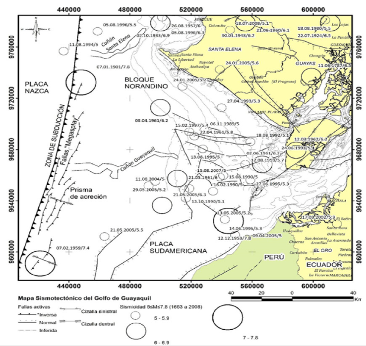 El perfil costero de nuestro país, se encuentra frente a la zona de subducción entre la placa de Nazca y las placas continentales, es decir la Sudamericana y del Bloque Nor-Andino, (Eguez A., 2003), (Espinoza, 1992), (Mendoza & Dewey, 1984); con una velocidad de desplazamiento de 6 a 8 cm/año (Baldock, 1983), (Barazangi & Isacks, 1976), (S., 1995), (Bourdon & Eissen, 2003), (Gutscher, 1999), (White S.M., 2003). (Collot , y otros, 2010). Entre la placa oceánica y el segmento continental existe un canal de subducción que amortigua y no permite la ruptura ni la generación de terremotos mayores a 8 grados en Escala de Richter. (Chunga y Quiñonez, 2013).