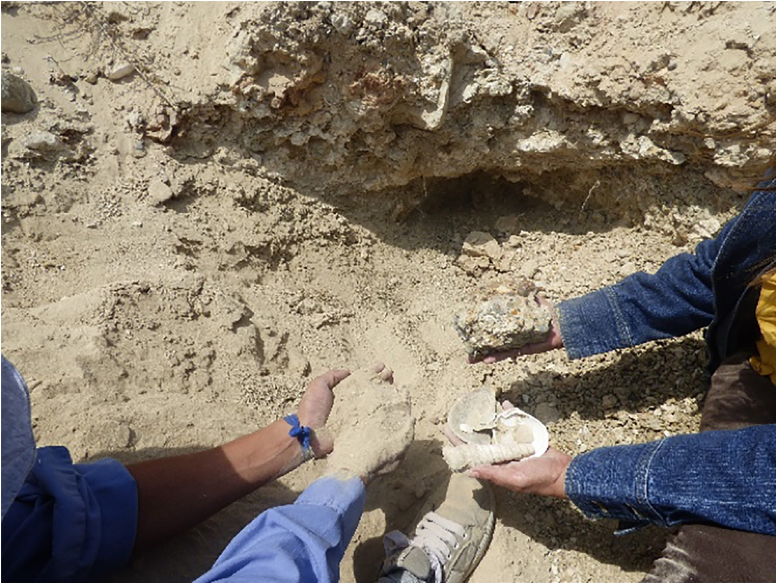 En las recopilaciones de las muestras de campo Figura 5, se pudo identificar depósitos aleatorios de limos sueltos con un alto contenido de carbonato de calcio (Calcita-CaCO3), restos de fósiles marinos, y conglomerados formados por clastos redondeados de tamaño máximo de 30 mm, que según el ensayo de difracción de rayos x tiene un contenido de 48,53% de Calcita, realizado en PROINSTRA, compañia ubicada en Quito-Ecuador que corresponde a la calicata CT-27, ubicada en coordenada 2°19'38.1"S y 80°51'51.7"W colindante al pozo ANCDD-02.