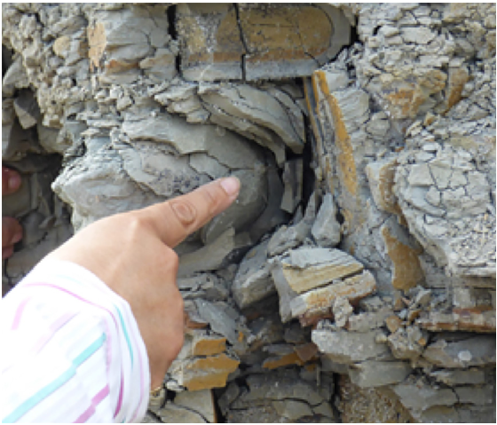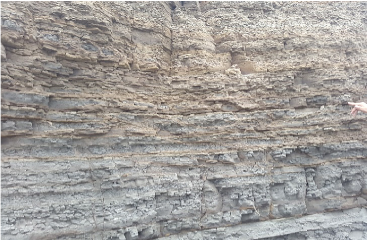 Se pudo observar en situ tal como lo muestra la Figura 6, los perfiles estratigráficos de los acantilados frente al mar entre Ancón y Antoncito, que en algunos sectores poseen intercalaciones de delgadas capas horizontales de lutitas, areniscas y limolitas, estructuras sedimentarias turbidíticas muy agrietadas, que corresponden al Eoceno Superior, grupo Ancón