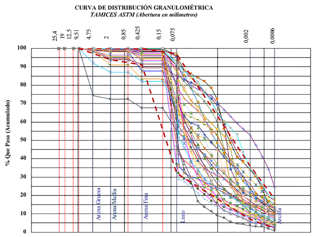 Como se puede apreciar en la Figura 8, representa las curvas granulométricas de las 31 muestras obtenidas de las exploraciones de campo en la que se puede concluir que en el sector de estudio existe de 0 a 5% de arena gruesa, de 1 a 9% de arena media, de 1 a 25% de arena fina, de 63 a 56% de limos y de un 5 a 35% de arcilla.