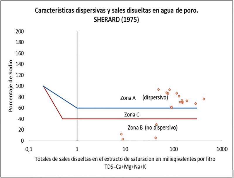 Los valores obtenidos en el ensayo de Porcentaje total de sales disueltas o ensayo TPDS, se los incorporó en la Carta de Sherad (Figura 13), obteniendo que la mayoría de los suelos se encuentran en la zona A (Dispersivos) como suelos dispersivos.