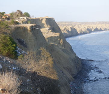 En los acantilados que forman el perfil litoral en el sector geográfico de Anconcito, se identifican materiales de textura muy fina que con el paso del tiempo están afectados por las condiciones del medio físico existente en este sector como son: cambios en la temperatura, variaciones de la velocidad del viento, influencia de la humedad ambiental por el rompimiento de las olas al pie del talud y la propia perdida del contenido de humedad natural de estos materiales, lo que ha facilitado la meteorización y cambios en las propiedades geotécnicas de los materiales originales.