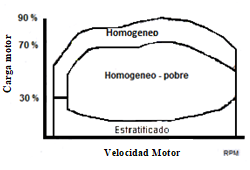 Los parámetros para determinar el modo de trabajo estratificado, homogéneo y homogéneo pobre se indican el manual del fabricante (Mazda, 2013) y se observa los rangos de trabajo en función de la carga y velocidad angular del motor como se indica en la figura 1. Además, las principales variables para determinar los modos de trabajo son: las revoluciones del motor que es la velocidad angular con que gira el cigüeñal y se mide en rpm. La carga representa un valor para un régimen de giro dado, el grado de carga expresa la relación entre el par máximo del motor a ese régimen y está en %. Los valores de datos utilizados de las rpm y la carga se los puede observar en el valor del PID de la línea de datos indicado en el escáner respectivamente (Society of Automotive Engineers, 2002). Al realizar la experimentación se obtienen los valores de carga y rpm los cuales se ubicara en el diagrama y se encontrara el modo de trabajo que corresponde al tipo de estratificación y es ejecutado por la ECU.