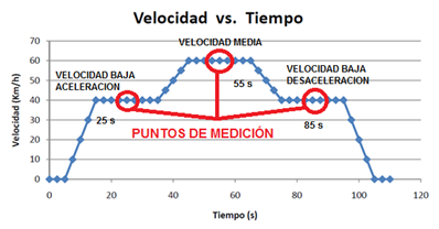 Los datos a analizar son los valores de revoluciones y carga de motor obtenido a los “25s”, “55s” y “85s” debido a que son los datos más estables del ciclo, y se utilizara estos valores para ubicar en el diagrama revoluciones vs carga y así obtener el tipo de mezcla o modo de trabajo ejecutado por la ECU. El desarrollo del ciclo y los puntos de tomas de datos se pueden observar en la figura 2.