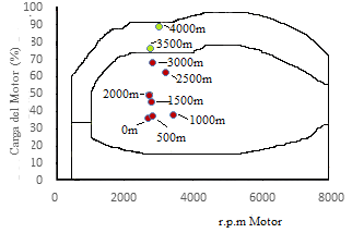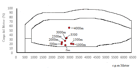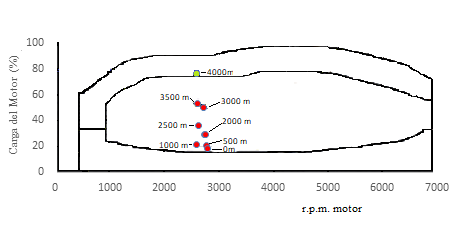 En la figura 3 se representan los modos de trabajo ejecutados a 40 km/h en aceleración a los 25s del ciclo de manejo, se puede observar que en todas las condiciones de altura excepto la mayor, 4000 msnm, se produce un modo homogéneo pobre debido a que de los valores de las alturas de 0 msnm hasta los 3500 msnm se mantienen en el rango de este tipo de mezcla que en esta condición esta entre 17,5% a 73% de carga y de 2500 a 3000 rpm las revoluciones. En la condición de mayor altura se produce el modo homogéneo debido a que esta mezcla se ejecuta a una condición de 73,1% a 95 % de carga y con el rango de rpm de 2500 a 3000 rpm y a la mayor altura del experimento que fue 4000 msnm tenemos una carga de 76,4% y a 2588 rpm.