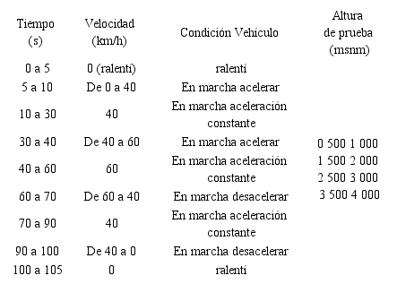 El ciclo de conducción es basado en las normas de prueba de la SAE (Society of Automotive Engineers, 2008) y en un estudio similar (Robles y Martínez, 2010), pero en un vehículo a gasolina con inyección indirecta de combustible debido a que se obtuvieron resultados confiables y que garantizan una repetitividad. Además, el ciclo de prueba se adaptó a las mismas condiciones de variación de altura con respecto al nivel del mar, ya que se quiso estudiar para establecer también una comparación con este estudio. Se establece una ruta que brinde las condiciones necesarias de circulación y se pueda cautelar la seguridad de los conductores, que cumpla con las variaciones de altura necesarias y una pendiente máxima de 5°. Se ejecutaron diez pruebas en cada altura, cada ciclo de prueba tiene una duración de 110s, una longitud de 1,1 km, se realiza a temperatura de funcionamiento y se mantienen velocidades medias de “40 km/h” en aceleración y desaceleración y velocidad máxima “60 km/h”. El ciclo se detalla en la tabla 2.