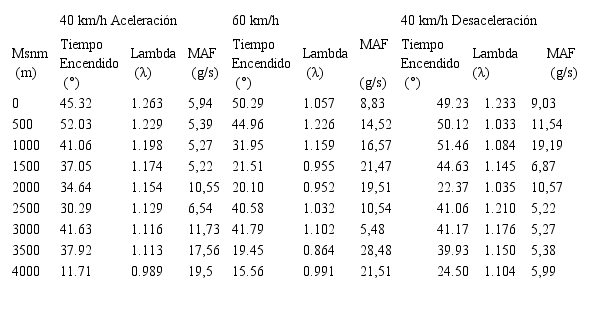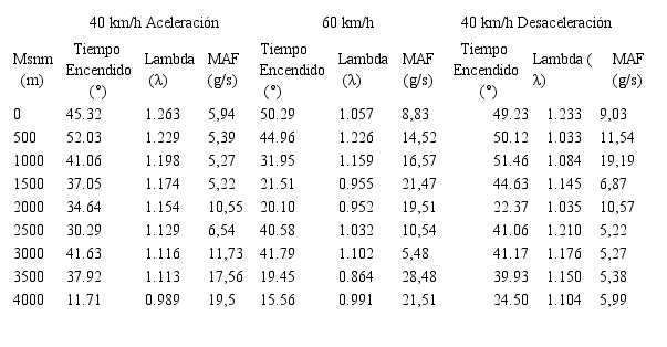 En las pruebas dinámicas se determinan los modos de trabajo que se producen en los tiempos de ciclo seleccionados en el protocolo de prueba en las condiciones de velocidad establecidas que son 40 km/h en aceleración, 60 km/h y 40 km/h en desaceleración, a las diferentes alturas seleccionadas los cuales se detallan en la tabla 3 y 4, donde se indican los valores de carga, rpm, presión de combustible, tiempo de encendido, lambda e ingreso de aire, para determinar el tipo de mezcla que el sistema de control del vehículo ejecuta de acuerdo a la variación de la altura.