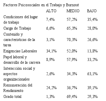 Los siete factores psicosociales estudiados resultaron ser factores de riesgo para la sintomatología fisiológica y la intelectual; no así para la sintomatología comportamental donde el único factor de riesgo detectado fue el “Papel laboral y desarrollo de la carrera”.
