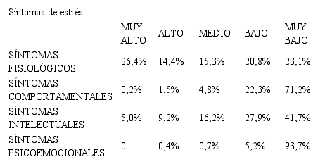 En cuanto a la presencia de estrés, predominó la sintomatología fisiológica con una prevalencia del 56,1% si agrupamos las calificaciones de “muy alto”, “alto” y “medio”; seguido de los síntomas intelectuales con prevalencia de 30,4% agrupando los mismos tres niveles; la presencia más baja la presentaron los síntomas de tipo psicoemocional con el 1,1% agrupando “alto” y “medio” ya que en nivel “muy alto” no se presentó ningún caso (Tabla 2).