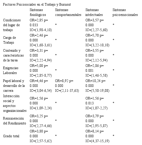 En cuanto a los Factores de Riesgo, los dos más altos corresponden al “Papel laboral y desarrollo de la carrera” que marcó un OR de 10,24 con los síntomas intelectuales de estrés y un OR de 8,92 con los síntomas comportamentales del estrés; el tercer lugar lo ocuparon los Factores Psicosociales totales con un OR de 8,14 para los síntomas intelectuales de estrés (Tabla 3).
