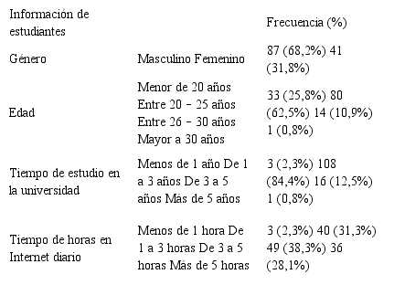 La escala usada para validar el instrumento proviene de Kwon y Wen (2010). Todos los ítems fueron puntuados en una escala Likert de 5 puntos (1 = totalmente en desacuerdo; 5 = totalmente de acuerdo). El instrumento de investigación está conformado por dos elementos; en el primero se recogen los datos de identificación de los estudiantes (género, edad, tiempo de estudio en la universidad y tiempo de horas en Internet diario) y el segundo se utilizó 30 ítems (variables).