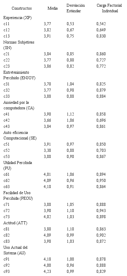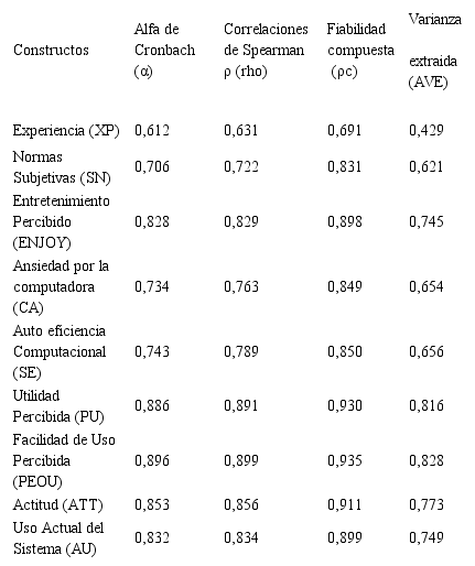 Luego se aplicó el análisis de fiabilidad y validez de los constructos que todos los coeficientes superan el umbral recomendado por Nunnally (1978), la fiabilidad de las escalas con el indicador Alfa de Cronbach, obteniendo todos los valores superiores al valor de referencia 0,7 excepto la Experiencia (XP).