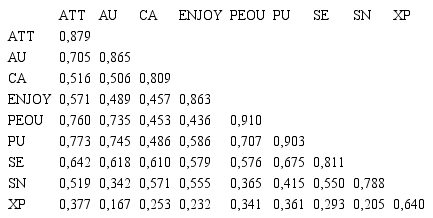 Con respecto a la fiabilidad compuesta, Nunnally (1978) recomienda un indicador mínimo de 0,7 que cumplen todos los constructos menos la Experiencia (XP) y para las varianzas extraídas de 0,5, como recomiendan Bagozzi y Yi (1988). Todos están encima de lo recomendado excepto la Experiencia (XP), como se muestra en la Tabla 3.