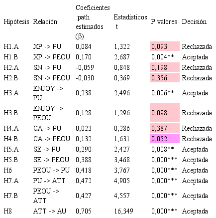 Teniendo en cuenta los ocho constructos elegidos para esta investigación, en referencia a las pruebas de hipótesis, se encontró que las Normas Subjetivas (SN), no era concluyente en el modelo relacionado con la Utilidad Percibida (PU) y la Facilidad de Uso Percibida (PEOU), también el Entretenimiento Percibido (ENJOY) no estaba relacionada con la Facilidad de Uso Percibida (PEOU), la Experiencia (XP) no influye en el constructo Utilidad Percibida (PU), y la Ansiedad por la computadora (CA) no era determinante con los constructos Utilidad Percibida (PU) y Facilidad de Uso Percibida (PEOU).