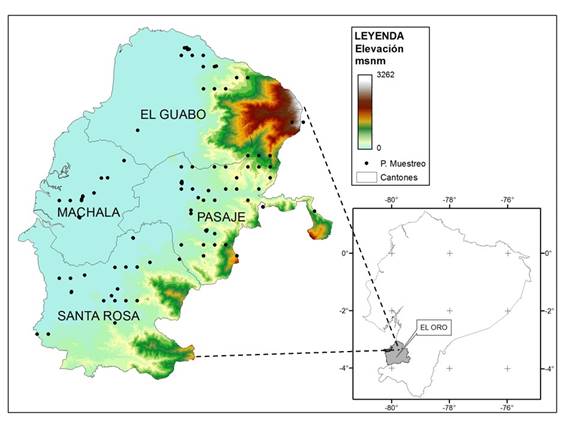 La investigación fue descriptiva de tipo transversal y correlacional, donde no se modificó las variables en estudio, con la finalidad de obtener información fácilmente verificable de fuentes primarias, que se obtuvo de entrevista a 73 productores de cacao de la provincia de El Oro (Ecuador), ubicada entre las coordenadas 05°-3.62° S y 79.55°-80.06° O. Área que compren a los municipios El Guabo, Machala, Pasaje y Santa Rosa. (Figura 1). El clima es Tropical Megatérmico, promedio de temperatura de 26 °C y precipitaciones promedio anual de entre 550 a 1700 mm (Luna-Romero et al., 2018)