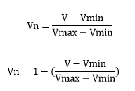 Dónde: Vn= Valor normalizado; V= Valor observado sin normalizar, Vmin= Valor mínimo del total de datos, Vmax= Valor máximo del total de datos