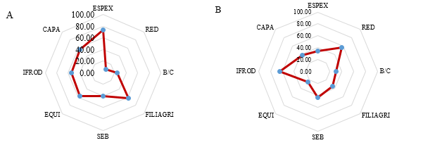 Los indicadores normalizados seleccionados del ACP (Tabla 5), produjo la selección de todos los indicadores. En la dimensión económica las medias de los tipos de cacaos fueron diferentes (Nacional=0,36; CCN51=0,41), donde los indicadores ESPEX y RED en los tipos de cacao Nacional y CCN51 respetivamente fueron lo de mayor puntuación a diferencias del indicador B/C con valores próximos. Esto produjo que no se produzca diferencia significativa (p=0,263). Mientras que, en la dimensión social las medias del total de indicadores fueron 0,54 y 0,41 para los tipos de cacao Nacional y CCN51 respetivamente. Esta diferencia indica significancia (p=0,002) estadística. La diferencia de los indicadores sociales según Fawaz-Yissi y Vallejos-Cartes, (2011) es por la interdependencia de los SA en función de sus manejo, disponibilidad de mano de obra y por aspectos externos (accesos a las fincas, falta de servicios básicos, etc.). Mazabel-Domínguez et al., (2010) expresan que los modelos asociados o agroforestales con el cacao Nacional, tiene un mayor grado de afinidad con sus vecinos por una cuestión de subsistencia conformando modelo organizativos dependientes, mientras los modelos en monocultivo son más independientes.
