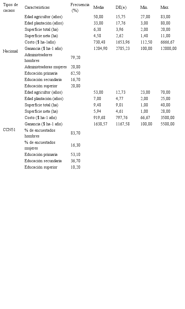 El análisis de las características económicas y sociales por tipo de cacao se presenta en la tabla 1. Donde la media de edad entre los agricultores difiere muy poco (Nacional=50 años ±15,75; CCN51=53 años ±12,73), contrario al promedio de edad de las plantaciones (Nacional= 33 años ±17,76 y CCN51=7 años ±4,77). En los casos de la superficie total y neta es mayor en el tipo Nacional con 6,38 ±3,96 y 4,58 ±2,62 ha respectivamente. Diferencias que se atribuyen al sistema de siembra irregular y mayor fuste de las plantas en el caso de del tipo Nacional (Cerda et al., 2014; Jadán, Torres, & Günter, 2012) y al sistema asociativo o agroforestal que incide en el aprovechamiento de la superficie.