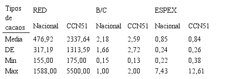 En la Tabla 2 se presentan el análisis estadístico para los indicadores económicos por tipos de cacao, mostrando el indicador RED rangos de 476,92-2337,64 kg ha-1 para Nacional y CCN51 respetivamente, valores que indicaron significancia (p<0,00) entre dos tipos de cacao. En el caso de las medias en B/C (Nacional=2,18; CCN51=2,59) y ESPEX (Nacional=0,85; CCN51=0,84) las medias fueron muy próximas, pero con rangos mínimo en el cacao Nacional y máximo en los cultivares de CCN5. Resultados que no indicaron significancia estadística en B/C (p=0.50) y ESPEX (p=0,85).