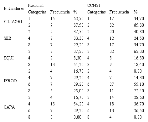 Los indicadores sociales se presentan en la Tabla 3. El indicador FILIAGRI presenta en la categoría 1, que corresponde a la respuesta positiva, mayor grado de integración social en los agricultores de cacao Nacional (62,50%) en comparación con los de CCN51 (34,70%). En el caso del indicador SEB la categoría 2 muestra un rango de 37,50% (cacao Nacional) y 40,80% (cacao CCN51) que indica ausencia de servicios básico en la finca, mientras que en las categorías 4 y 8 los rangos máximos fueron 33,30% (cacao Nacional) y 34,70% (cacao CCN51) respectivamente.