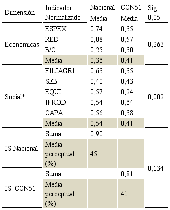 os indicadores normalizados seleccionados del ACP (Tabla 5), produjo la selección de todos los indicadores. En la dimensión económica las medias de los tipos de cacaos fueron diferentes (Nacional=0,36; CCN51=0,41), donde los indicadores ESPEX y RED en los tipos de cacao Nacional y CCN51 respetiva