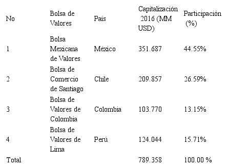 La integración de las bolsas de valores de los cuatro países tiene como objetivo desarrollar el mercado de capitales, otorgando a los inversionistas una mayor oferta de valores y emisores, en cambio a las empresas una gran fuente de financiamiento. La capitalización bursátil es igual a la multiplicación del precio de mercado de una acción por el número de acciones en circulación. La capitalización del mercado de las empresas que cotizan en el MILA en el 2016 fue de 789,36 billones de USD, cifra comparada con los 1784 billones negociados en la Bolsa de Sao Paulo en 2016 representa el 44.2%, se puede observar en la Tabla 1.