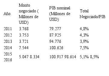 En Ecuador, en el periodo 2011-2016, la relación monto negociado con respecto al PIB osciló entre el 3,9% y 8,5%, estos valores son bajos si se comparan con otros países latinoamericanos, por ejemplo, en Chile es 79,2%, México con 35,2%, Colombia y Perú con 29,4%. Lo indicado se observa en la Tabla 3.