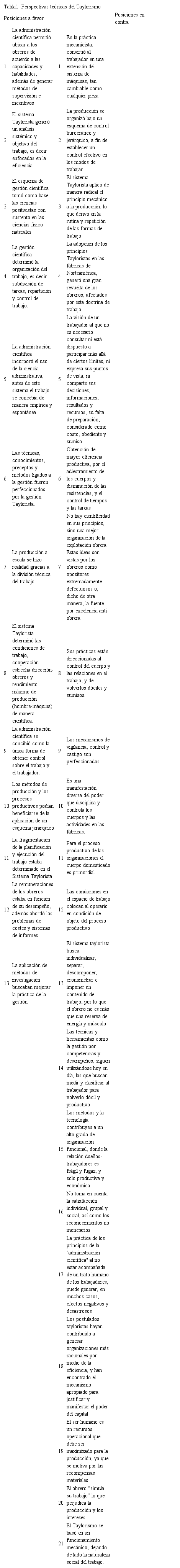 En resumen, el Taylorismo puede considerarse como un sistema de organización de trabajo, estructurado con base en la separación de funciones, especialización de tareas, control de tiempos y movimientos y remuneración por desempeño (de Morais y Moura, 2017). El sistema de Taylor ha facilitado a los directivos un “…nuevo medio de control: individualizar, separar, descomponer, cronometrar y, finalmente, imponer un contenido de trabajo en el que el empleado no es más que una reserva de energía intercambiable a voluntad” (Aktouf y Suárez, 2012). Las mismas técnicas y herramientas utilizadas hoy en día, como la gestión por competencias y desempeño. Técnicas que buscan medir y clasificar al trabajador para volverlo dócil y productivo (Souza y Da Costa, 2013).
