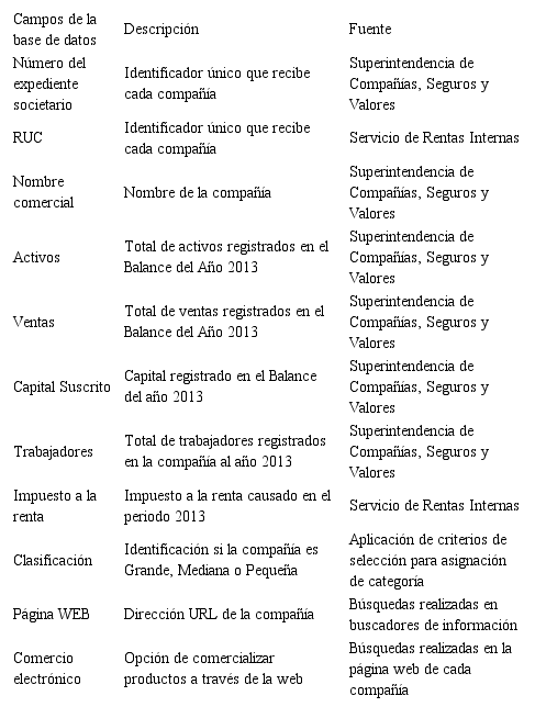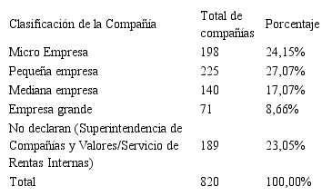 La investigación sistematiza la información contenida en las bases de datos del Portal de Información / Sector Societario de la Superintendencia de Compañías, Valores y Seguros y en las consultas de Estado Tributario e Impuesto a la Renta Causado del portal del Servicio de Rentas Internas. A partir de esta información, se desarrolló un procedimiento para categorizar a las empresas en pequeñas, medianas o grandes; con base en los criterios establecidos en la Resolución 1260 de la Secretaría de la Comunidad Andina de Naciones, de 2009, que trata sobre la Disposición Técnica para la Transmisión de Datos Estadísticos de PYME de los Países Miembros de la Comunidad Andina misma que propone una clasificación sustentada en los umbrales establecidos en el Art. 3 de la Decisión 702 de la Comisión de la Comunidad Andina de 2008. Este artículo establece los criterios de clasificación en relación al personal ocupado y al Valor Bruto de las Ventas Anuales (US$).