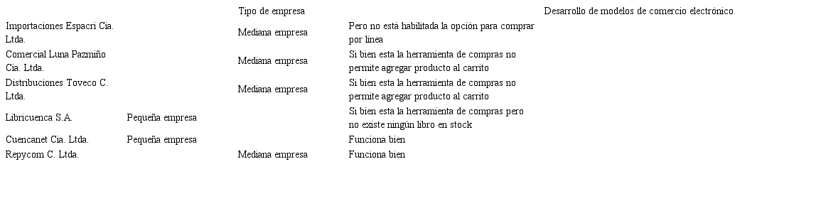 El análisis demuestra que solo 68 pymes comerciales del cantón Cuenca (18,78%) poseen una página web, registrada a la fecha de consulta, cuya finalidad es ofrecer información institucional, datos de contacto y ubicación, oferta general de bienes y/o servicios mediante la publicación de información de productos y/o noticias en el sitio. Sin embargo, de este grupo, sólo 6 compañías registran un modelo para compras a través de la web, que, si bien está incluido en el diseño de la página web a través del “carrito de compras”, no en todos los casos funciona.