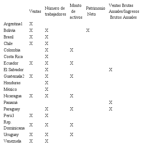 Para el caso de América Latina, Cardozo, Velasquez de Naime, & Rodriguez Monroy (2012) han realizado un completo análisis sobre los criterios que utiliza cada país de la región para establecer su propia definición de pyme.