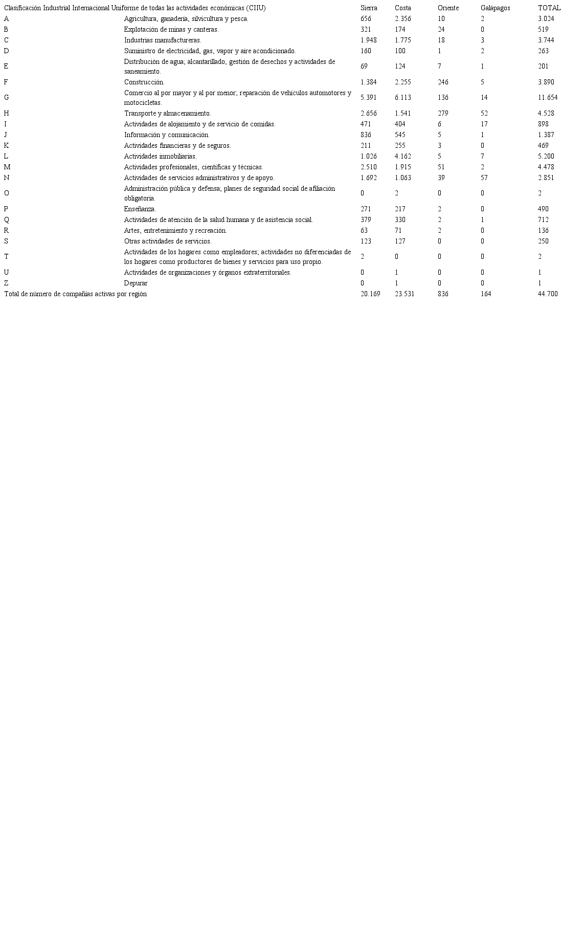 Al tomar en consideración la clasificación de la actividad económica según las diversas regiones del país se evidencia que la clasificación más predominante en la región costa y sierra es la “G” Comercio al por mayor y al por menor; reparación de vehículos automotores y motocicletas, la “H” Transporte y almacenamiento para el Oriente y “N” Actividades de servicios administrativos y de apoyo para Galápagos. Esta clasificación incluye a todas las empresas, sin discriminación de tamaño.