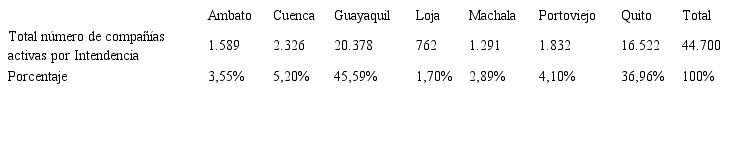 La Superintendencia de Compañías y Valores del Ecuador agrupa a las diversas compañías en base a la Intendencia que las controla; dentro del país existen siete dependencias en las ciudades de Quito, Guayaquil, Cuenca, Ambato, Loja, Machala y Portoviejo. La tabla siguiente muestra el total de compañías existentes por distrito.