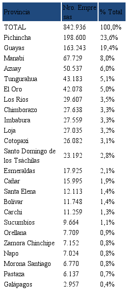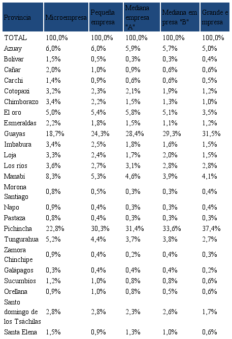 Al analizar la Tabla 4 resalta la provincia de El Oro con un porcentaje adecuado de empresas según su tamaño en el año 2015, también puede observarse que la mayoría de provincias que tienen un moderado porcentaje son las microempresas, pequeña empresas y mediana empresa "A", donde las personas acceden más para tener sus empresas. Al analizar las provincias con mejores porcentajes de empresas está Guayas con el porcentaje mayor 31,5% con grandes empresas y Pichincha 37,4%. Además las provincias con menores porcentajes son Morona Santiago con 0,3% en medianas empresas "A" y "B", Napo 0,3% en medianas empresas "A" y "B", Pastaza 0,3% en medianas y grandes empresas, Zamora Chinchipe 0,2% en mediana empresa "A", Galápagos 0,2% en grandes empresas y Orellana 0,5% en medianas empresas "B".