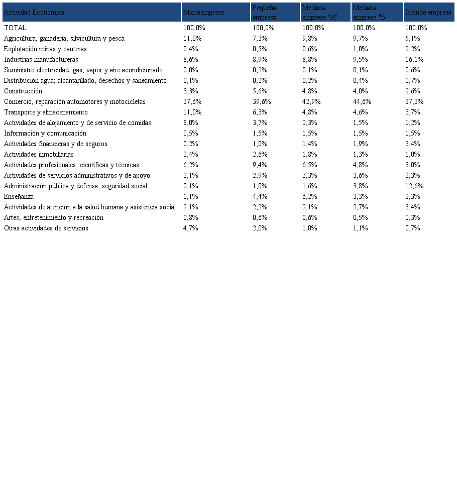 En la Tabla 5 se presenta el porcentaje de empresas según su actividad, resaltando que las empresas grandes, pequeñas, medianas y microempresas sobresalen con un alto porcentaje en la parte comercial.