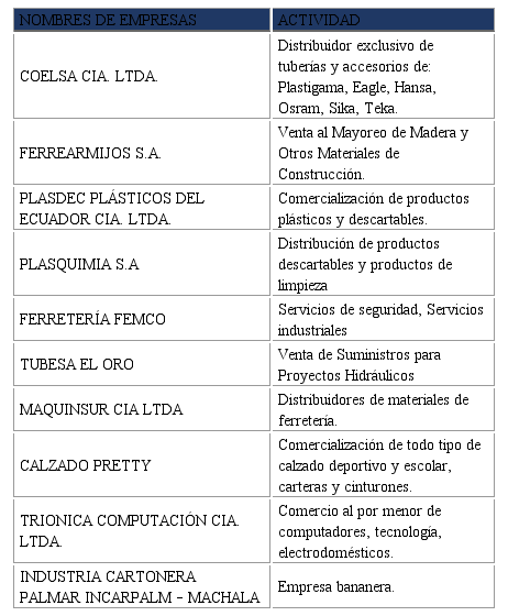 Finalmente, en la Tabla 6 se muestran algunas empresas comerciales que están asentadas en la ciudad de Machala, Ecuador.