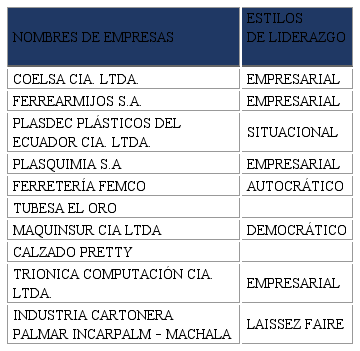 Al momento de realizar un análisis de los estilos de liderazgo que utilizan las empresas comerciales de la ciudad de Machala, provincia de El Oro, se pudo verificar que la mayoría de las empresas usan un liderazgo empresarial, democrático, autocrático entre otros y no tienden a usar el estilo de liderazgo transformacional. En concordancia con (Kliksberg, 2011) un liderazgo se debe formar desde la niñez, adolescencia y en el mundo de las universidades; es decir desde que la persona pueda tomar conciencia de sus actos, para la obtención de un futuro desafiante y formativo y alcanzar todos los objetivos propuestos.