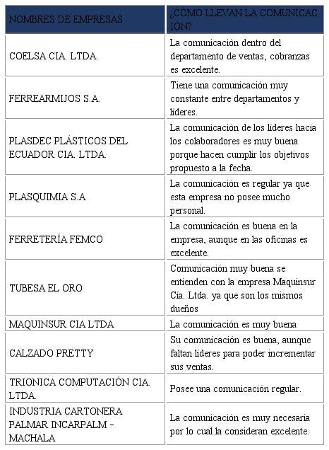 Integrando información por medio de la observación científica y artículos científicos, se pretendió conocer acerca de la comunicación en las empresas; es necesario recalcar que el funcionamiento de las empresas permite conocer su sistema de relación dentro de la misma. Se analizó y elaboró información referente a lo observado, son las empresas que están en el campo comercial, de servicios, entre otros, las que se han destacado por su mayoría. Entre ellas hay empresas privadas comerciales y empresas públicas comerciales, establecidas, en su mayoría, en el centro de la ciudad. Por lo tanto, las empresas del cantón Machala, provincia de El Oro, Ecuador, están insertas en el campo comercial a diferencia de otros campos.