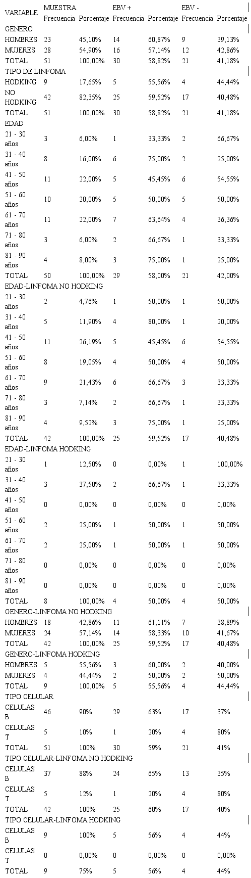La presencia del virus se observó más, en aquellos linfomas cuyo tipo celular predominante eran los linfocitos B (63%). Ver Tabla 1.