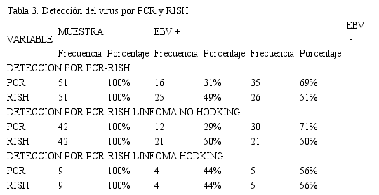 Se realizó una comparación entre las técnica de PCR y RISH en cuanto a la detección de VEB en LH y LHN, para estos resultados ver tabla 3 donde se observa que RISH tuvo mayor capacidad de detectar VEB en LNH comparado con PCR. Sin embargo, se obtuvieron los mismos resultados tanto para RISH como PCR en los casos de LH. Esto conduce a deducir que la técnica de RISH tiene una mayor sensibilidad en la identificación de VEB en muestras de tejido en parafina sobre todo en los casos de LNH, aunque al revisar la literatura se comprueba mejores resultados cuando se realizan concomitantemente(Hassan et al., 2006).