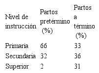 Más que la instrucción primaria, el factor de riesgo que pudo haber llevado a las mujeres a tener un parto prematuro, la falta de información a causa de un sistema escolar deficiente, el cual resultó ser un factor materno importante que llevó a un deterioro de la salud en aquellas embarazadas al no conocer la importancia de un control prenatal adecuado y precoz, por lo que no asistieron y no se trataron adecuadamente de infecciones urinarias ni previnieron a tiempo la rotura prematura de membrana, poniendo en en peligro la vida de su hijo y la de ella misma. Esto toma mayor importancia al reconocer que las dos terceras partes de las mujeres que pasaron por el parto a término, ostentaron instrucción secundaria y superior. (García, Pardo y Zúñiga, 2012).