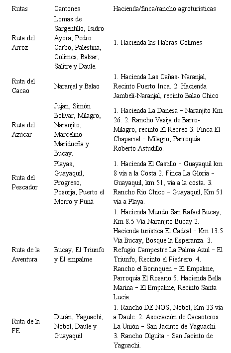 En Ecuador existen haciendas, fincas y ranchos que son un modelo de actividades agroturísticas sostenibles, que combinan lo natural, con la gastronomía y la cultura. El Gobierno Provincial del Guayas creó seis rutas turísticas para fortalecer la actividad del turismo rural desarrollado en haciendas, fincas, granjas para que sean conocidos y valorados (Tabla 1).