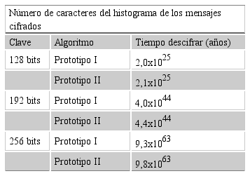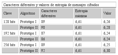 Se realizaron las pruebas de entropía para determinar el nivel de difusión existente en los mensajes cifrados con el Prototipo I y Prototipo II con claves de 128 bits, 192 bits y 256 bits, como se muestra en la Tabla 4.