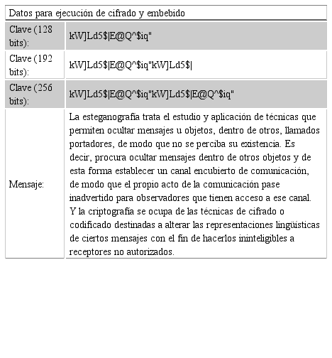 Para probar el proceso de cifrado y embebido con el Prototipo I y Prototipo II desarrollados, con claves de 128 bits, 192 bits y 256 bits, se utilizaron los datos de la Tabla 1.
